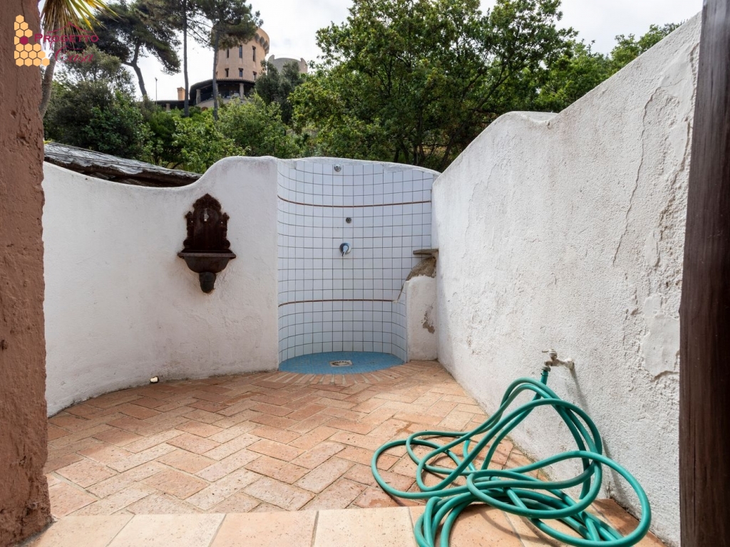 La discesa privata al mare conduce a una caletta con spiaggia sabbiosa attrezzata con ombrelloni e lettini, sorvegliata da bagnini per la sicurezza di tutti.